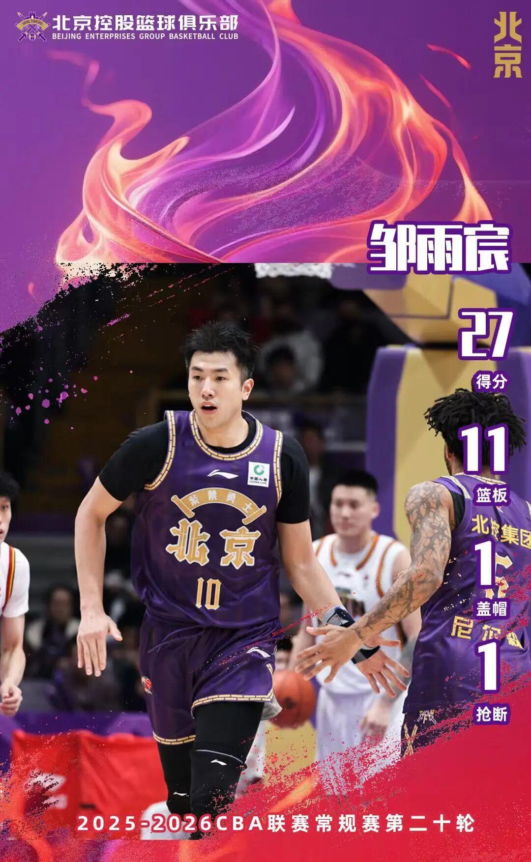 数据方面,邹雨宸拿下27分11篮板,里勒得到20分3篮板3助攻,基兹林克4投4中得到12分2篮板5助攻。